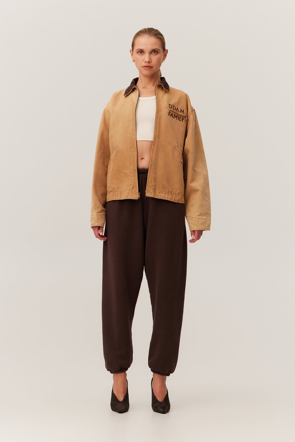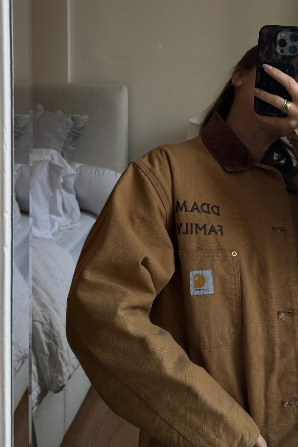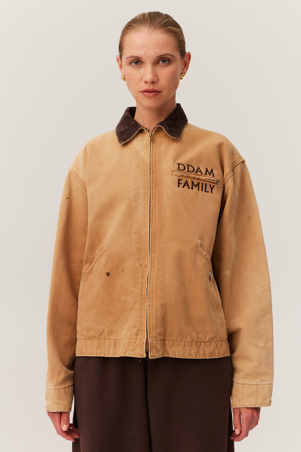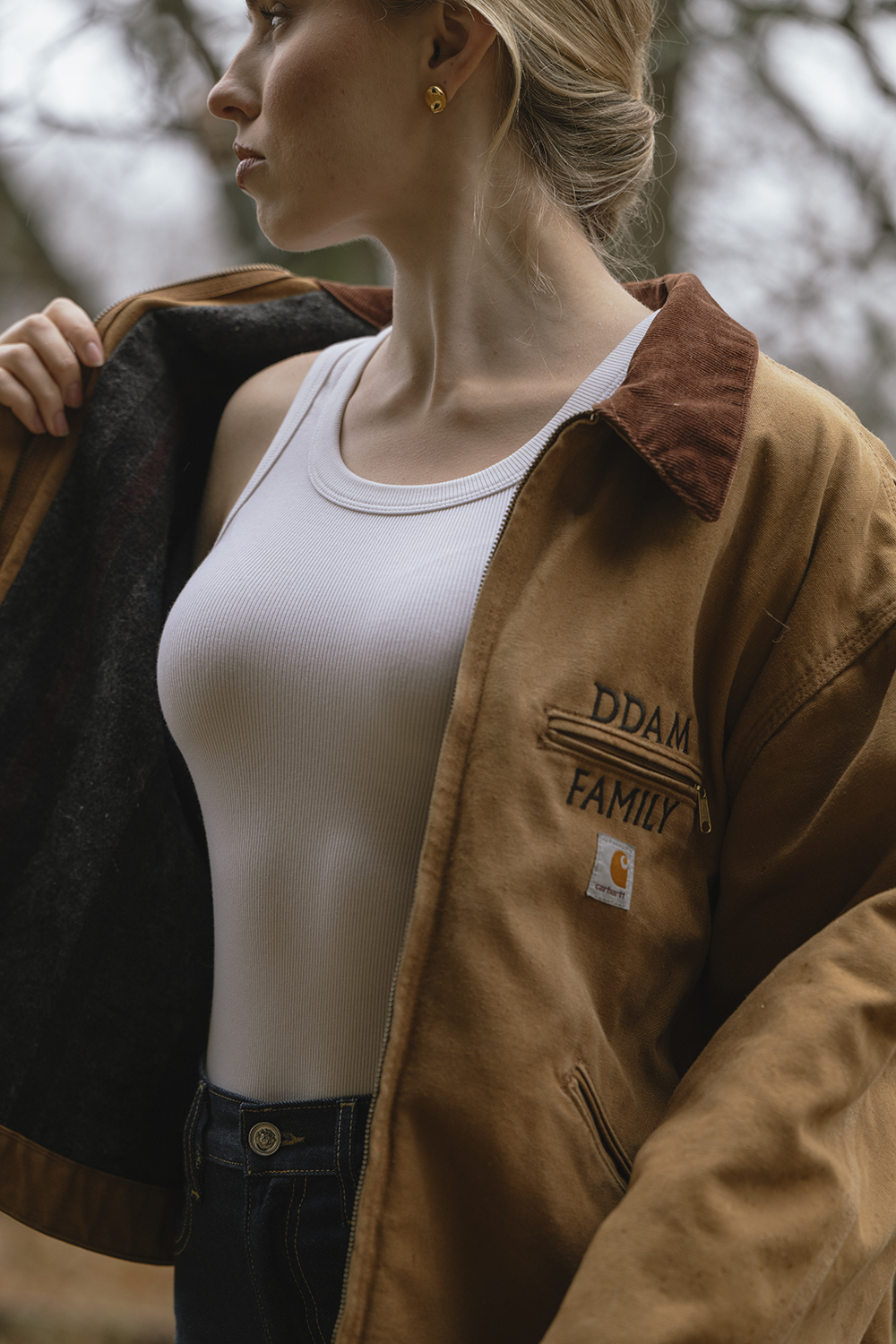 Meet our Reworked Vintage Carhartt Jacket- for the midwestern girl that dreams of living on a farm. Designed to take us back to our Detroit roots and celebrate our connection to the Midwest with the most iconic workwear brand to exist. Sourced through a local vintage shop, each piece is unique and worn, so you won't have any awkward run ins on the street. Each jacket has a zip front and is oversized. Finished with our embroidered DDAM Family logo in Bay on left front chest and center back. From barn doors to bar doors, because who says work jackets can't do happy hour?